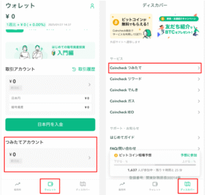 - 画面下メニュー「ディスカバー」>「Coincheck つみたて」の順にタップ。